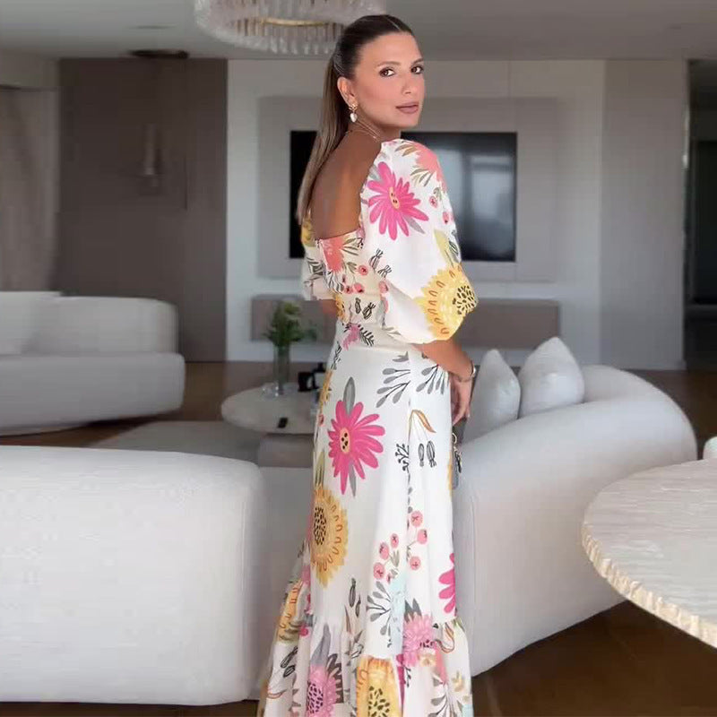 Square Collar Puff Sleeve Waist Trimming Stitching Dress